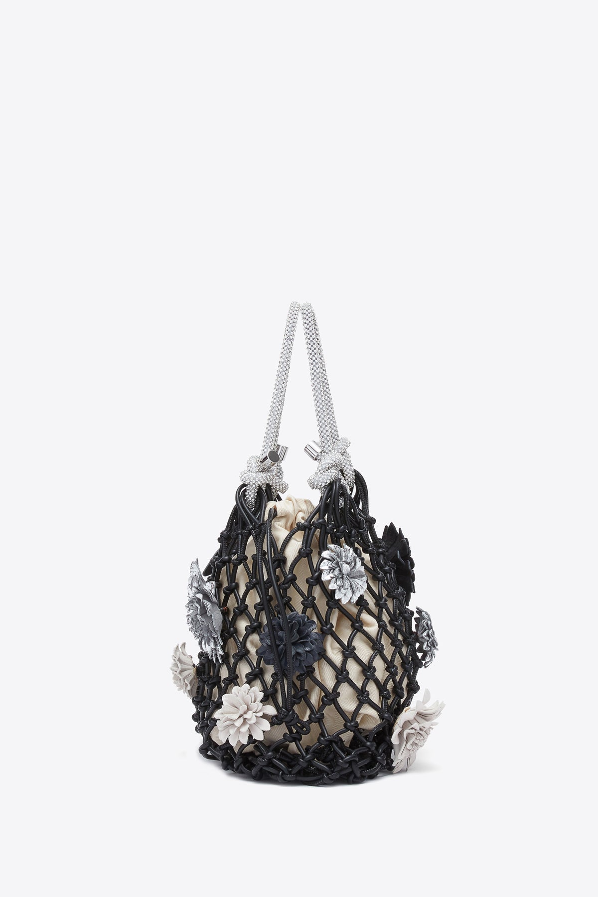 A fresh silhouette for the season, the Macrame Mini Sac combines artisanal craftsmanship with functional design. Featuring a handwoven macrame body adorned with leather flowers and crystal rope handles. The interior includes a removable cotton canvas drawstring pouch, secured with snaps at the base for added versatility. Use is to add textural interest to any outfit.