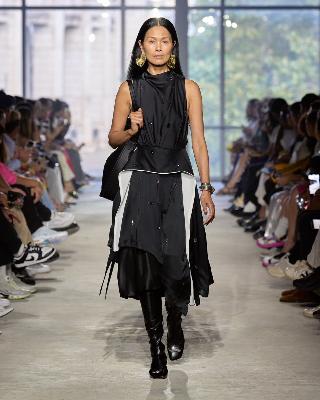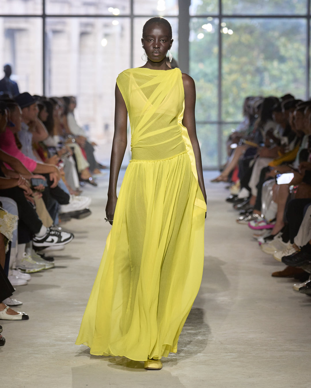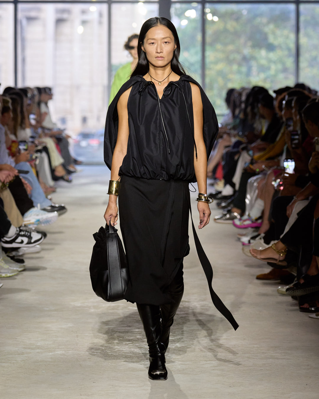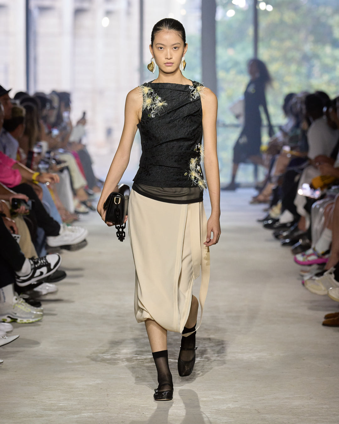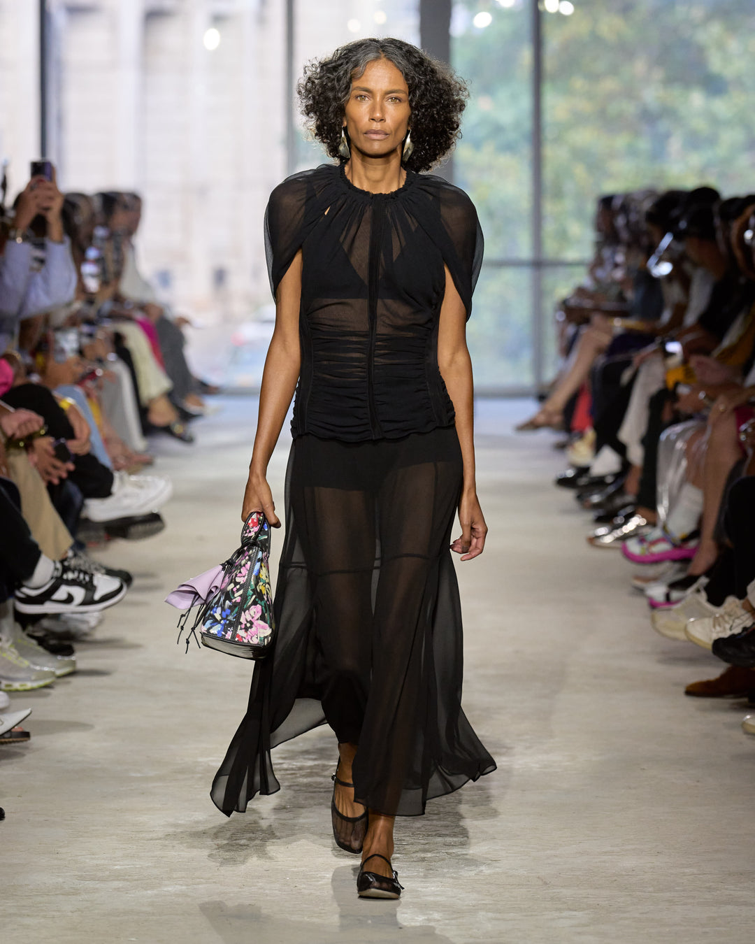Overlooking the Manhattan Bridge and historic Bowery in Chinatown, the Spring/Summer 2024 set pulls inspiration from the city and the community we celebrate. Models entered and exited scaffolding draped in voile, stepping into light inspired by an afternoon walk in Columbus Park.
