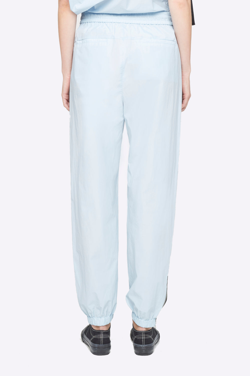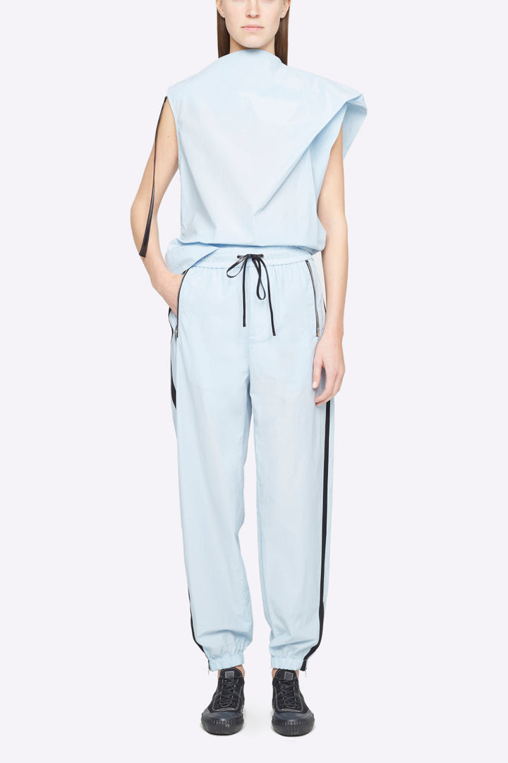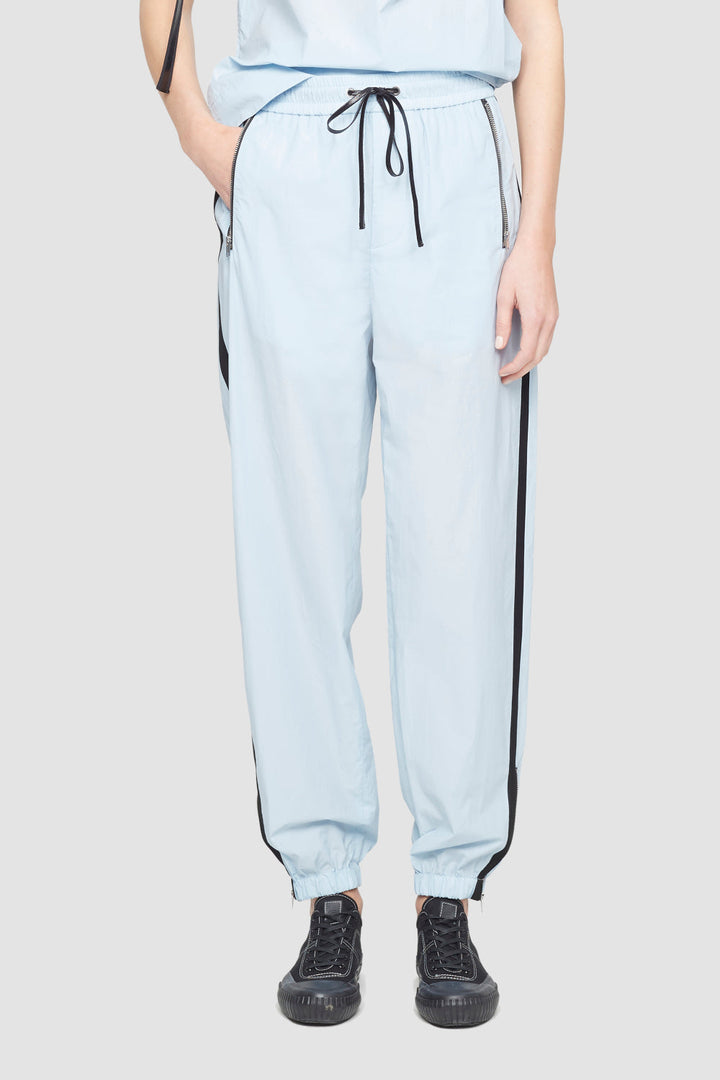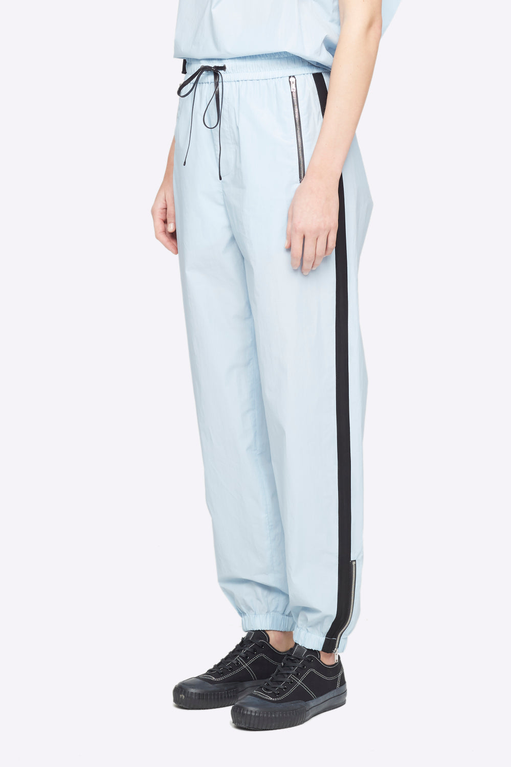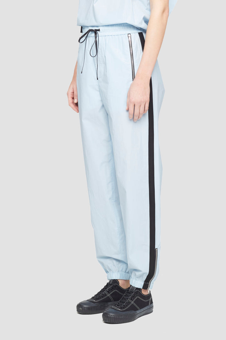 Airy tapered cotton jogger with contrast side stripes on both legs. Elasticated drawstring waist, zipped front pockets and zipped elasticated cuffs.