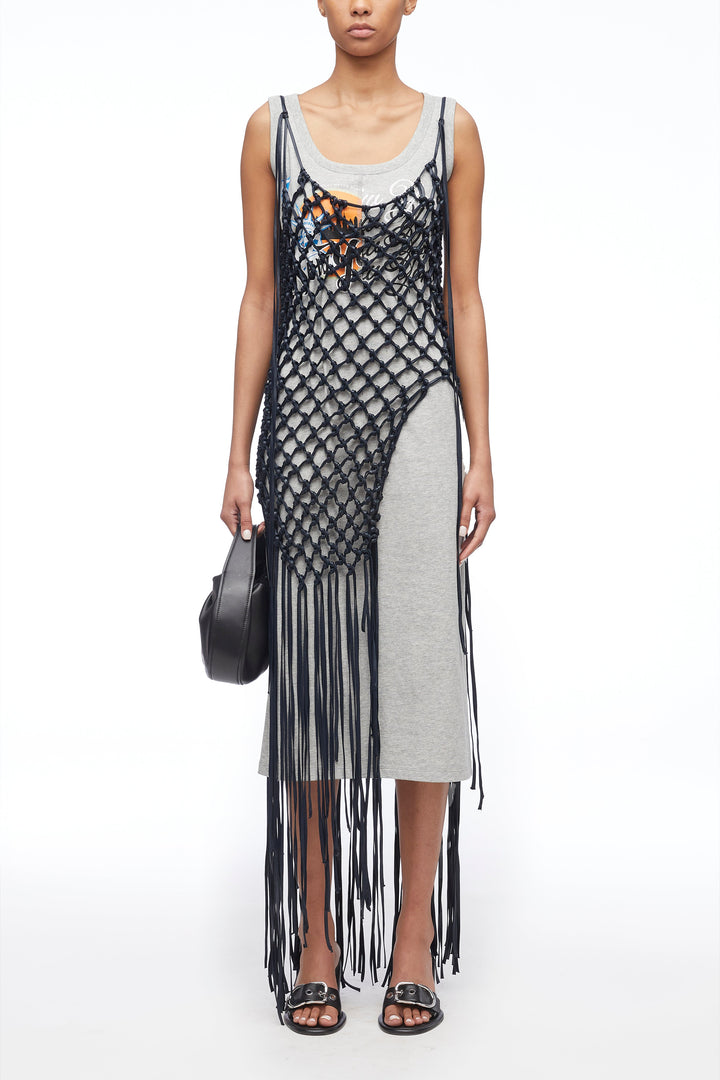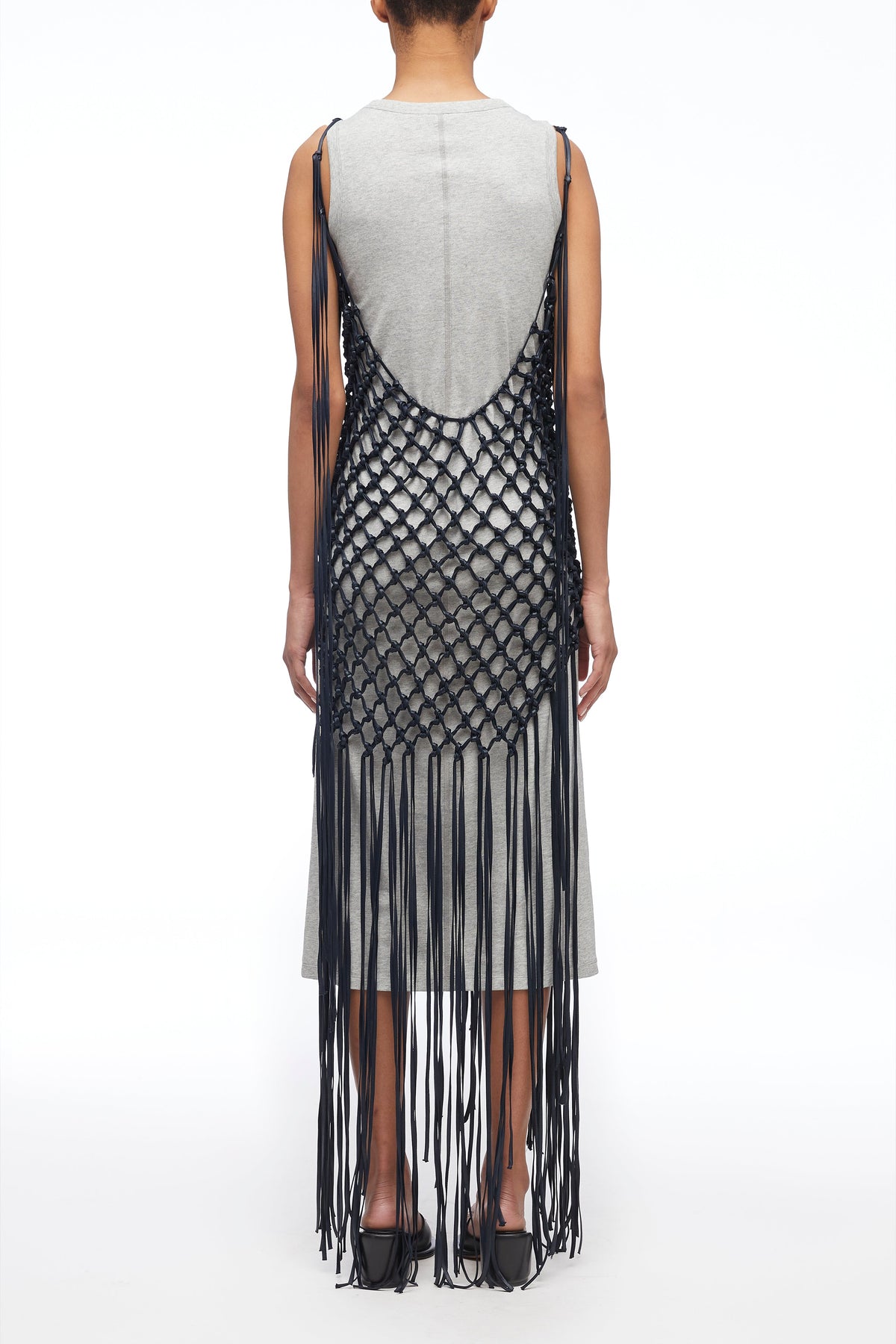 Dress with a macrame knit design. Scoop neck. Slim shoulder straps. Asymmetric tasseled hemline with front split.