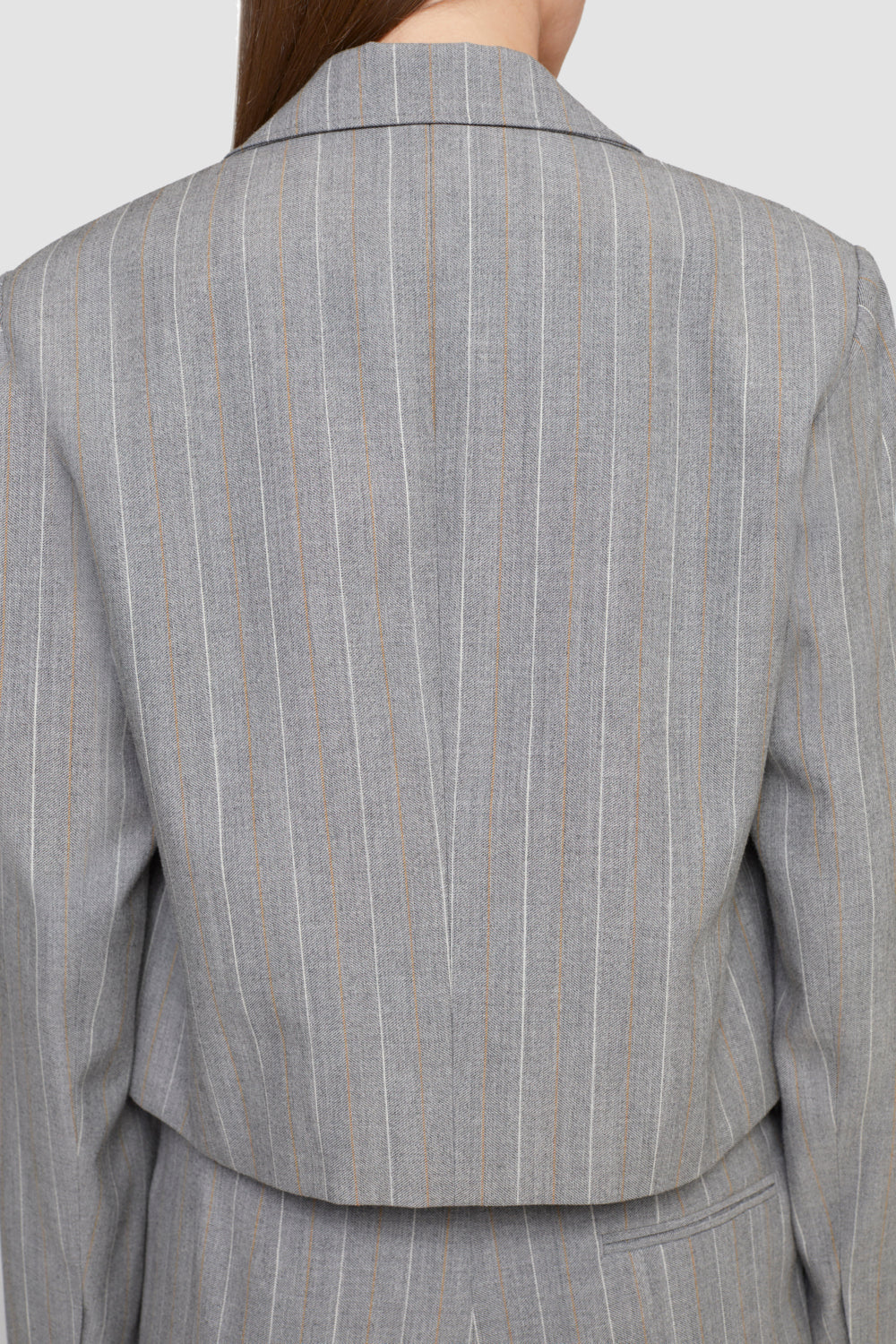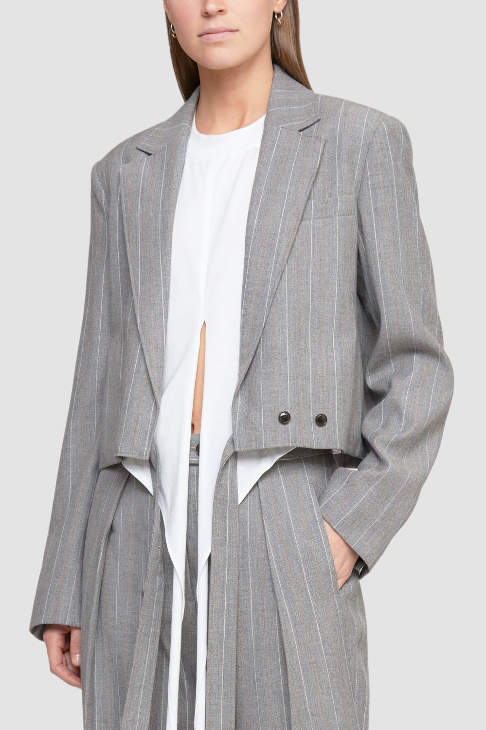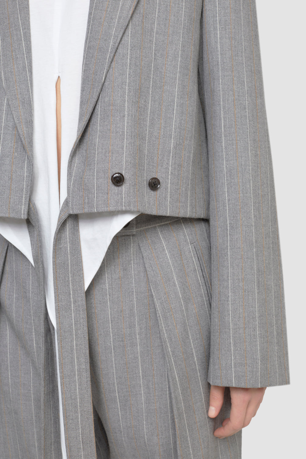 Cropped tailored blazer in a striped wool blend with notch lapels. Long sleeves with button cuffs. Chest welt pocket. Features extended ties at the waist with button closures.