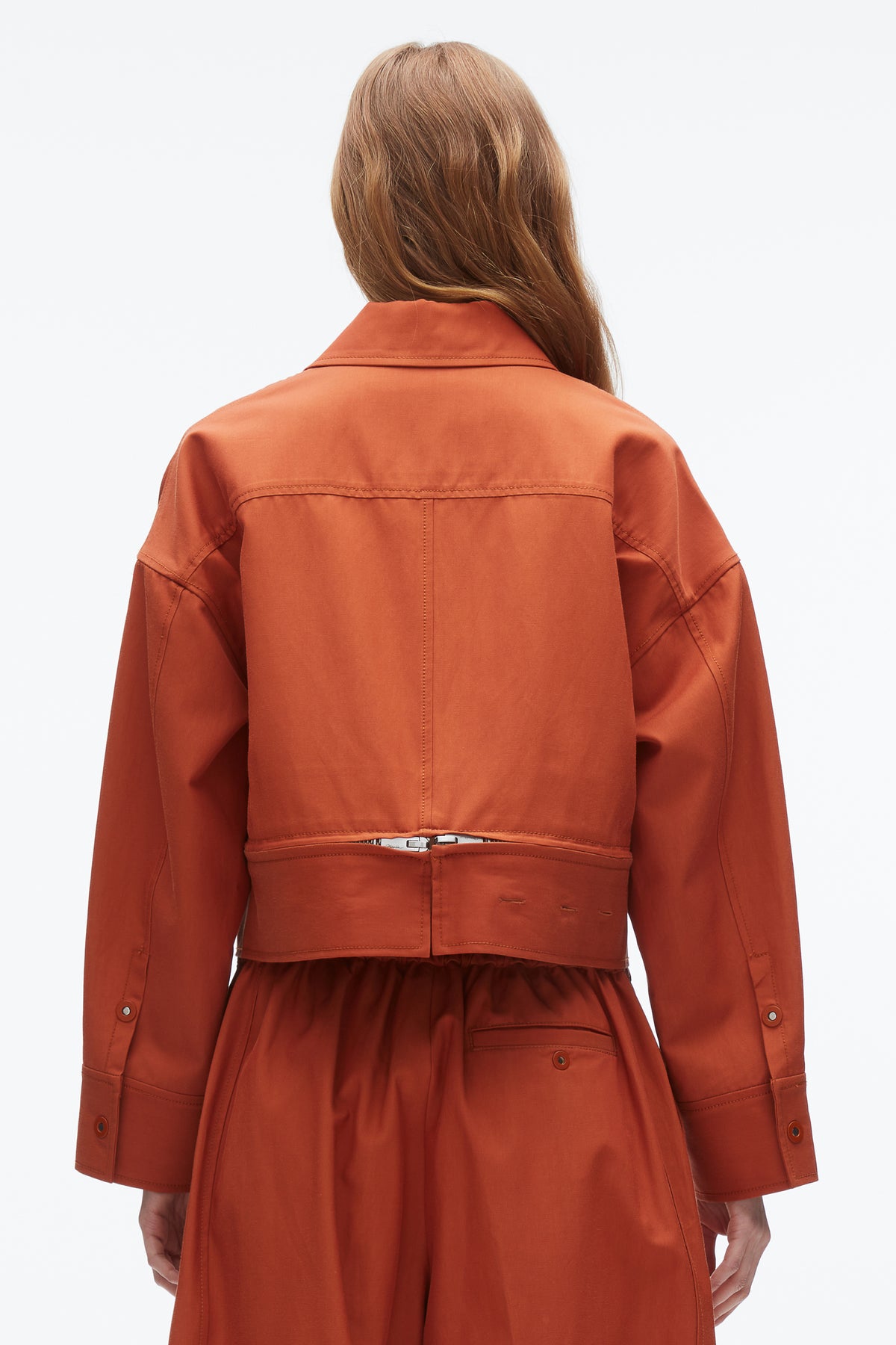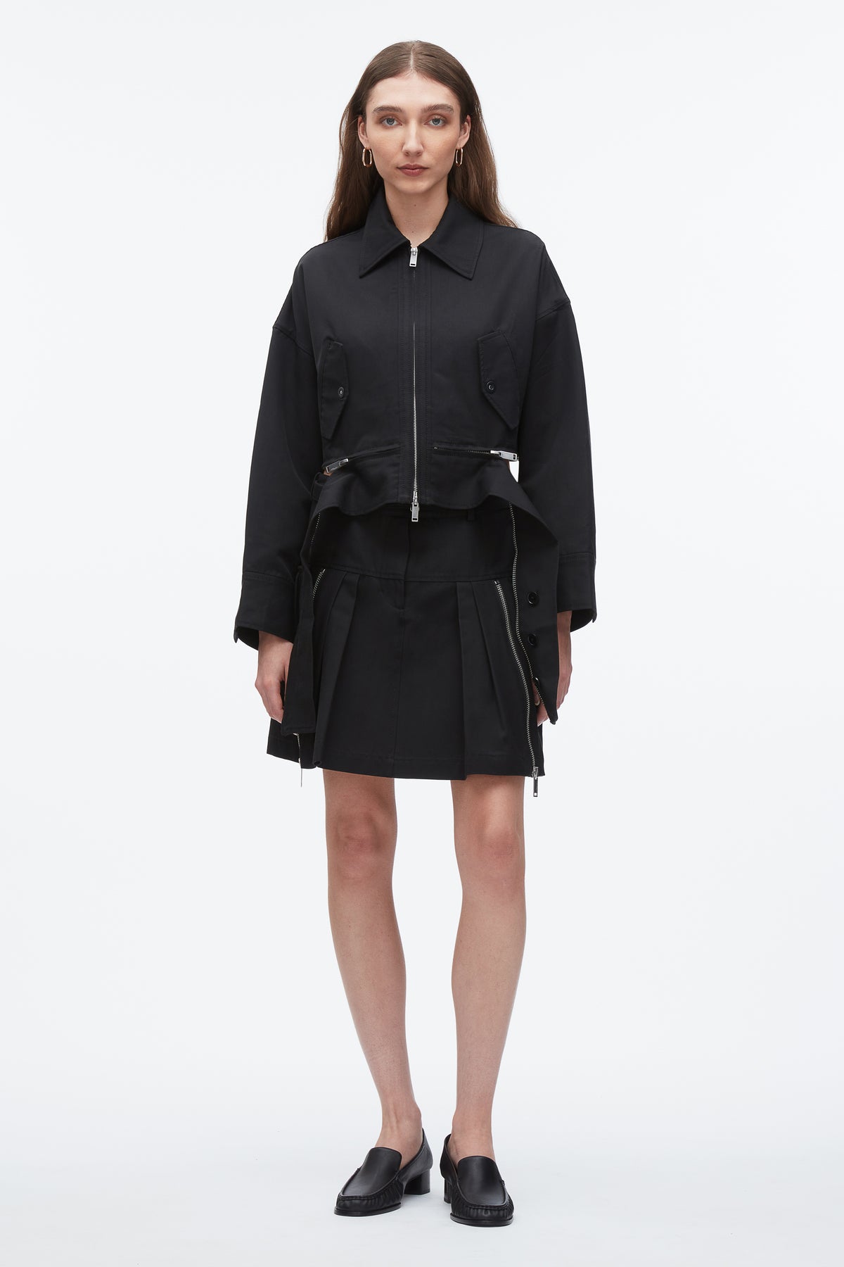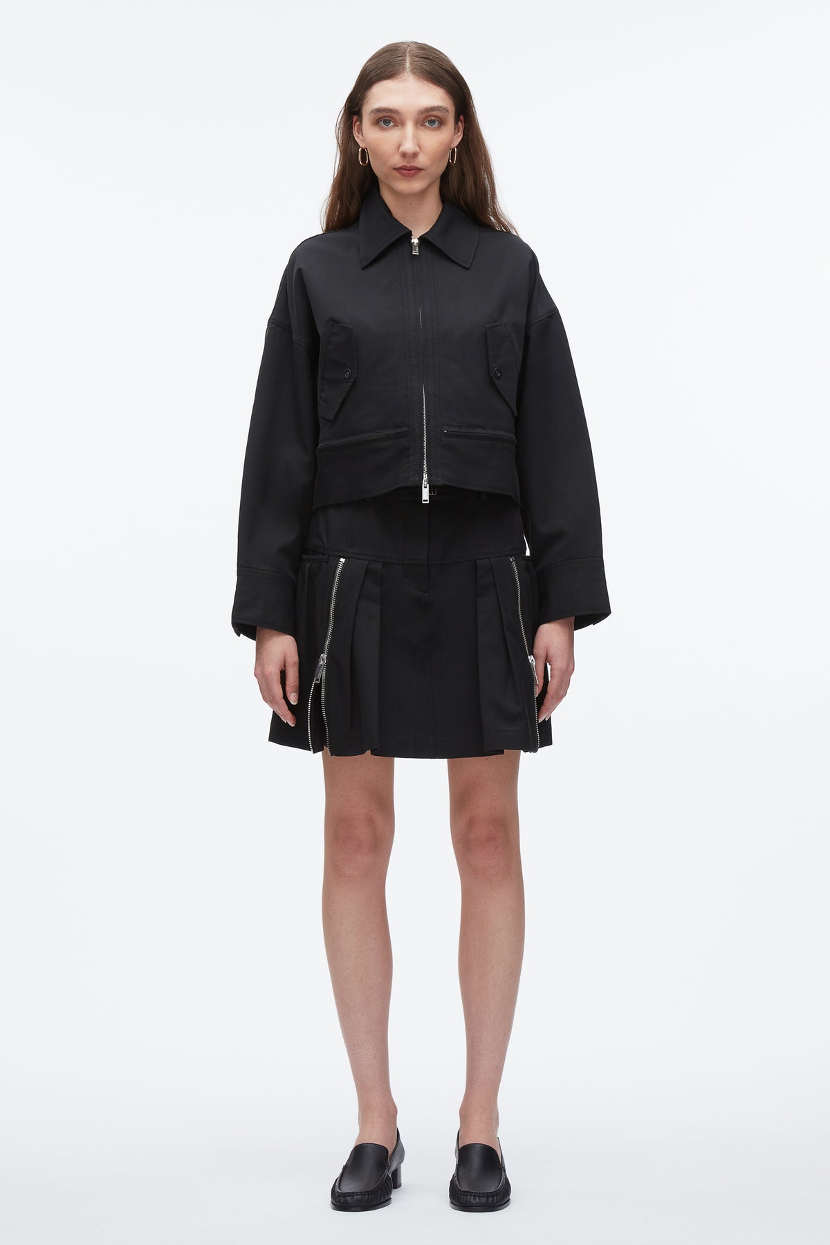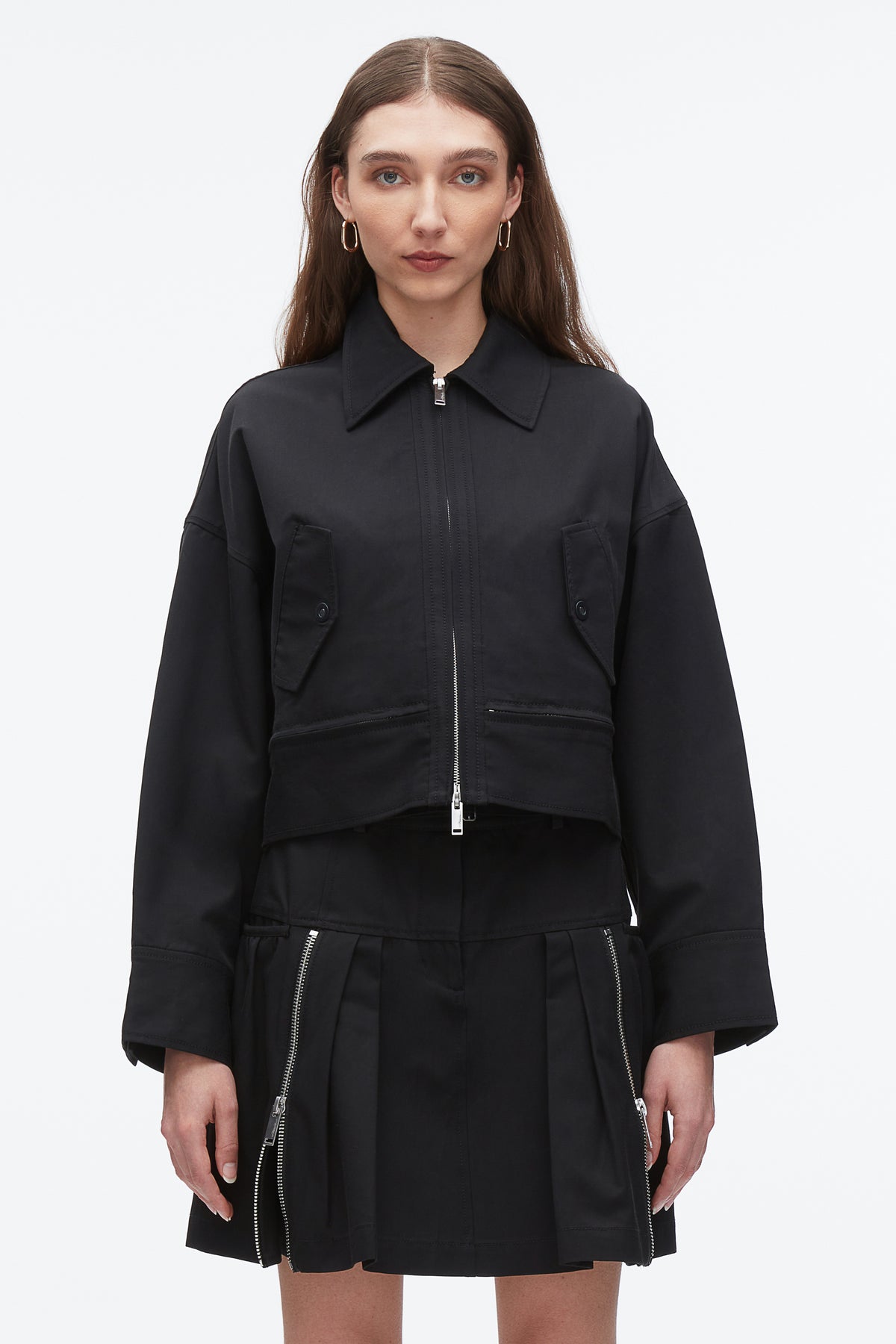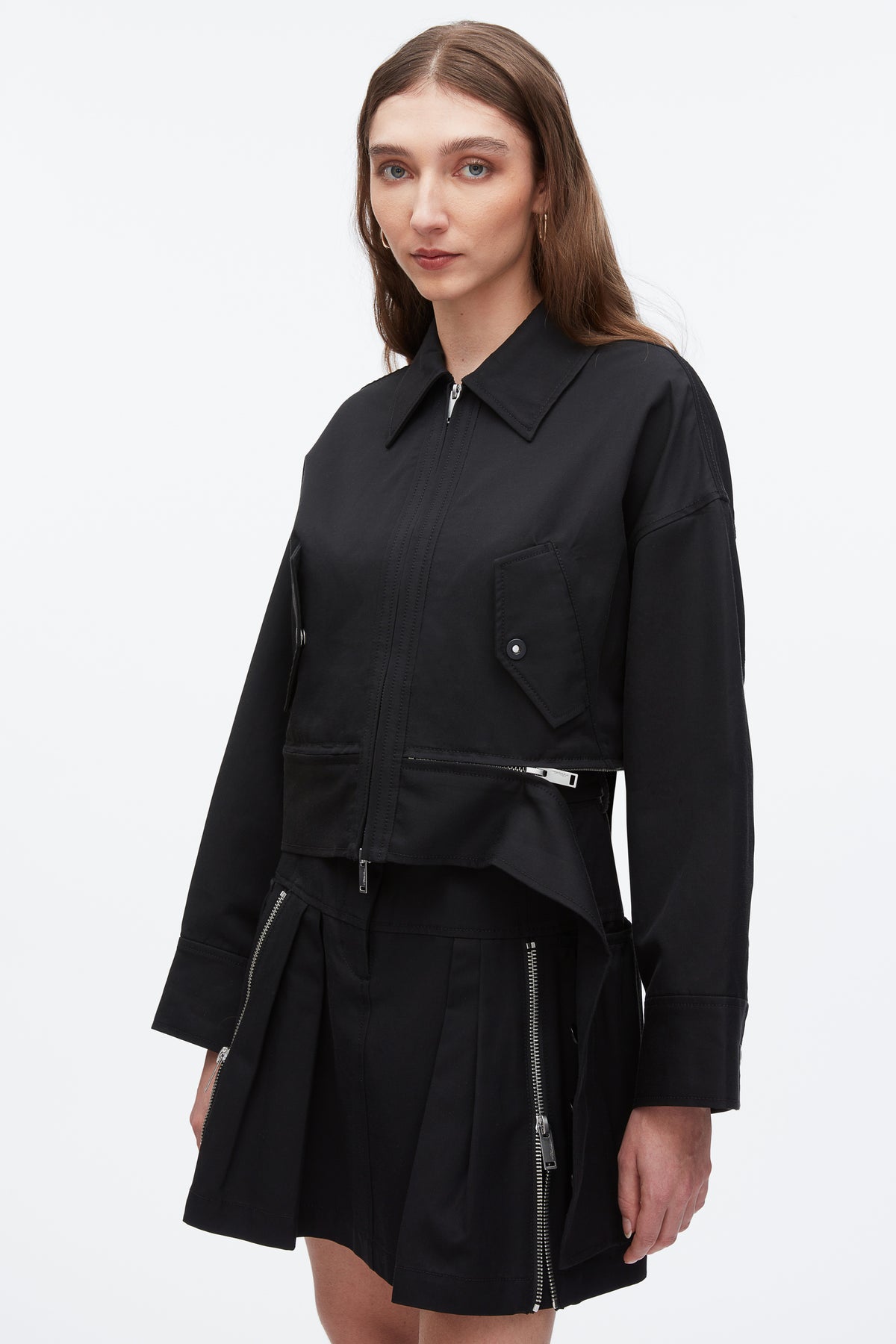 Grounded in utility but elevated in attitude, this cropped jacket reimagines the classic Harrington through a modern, feminine lens. Cut from a soft-yet-structured viscose twill, it features a trapeze silhouette with sculptural sleeves and a bold double zip detail at the hem—designed to wear closed or partially unzipped for added volume and shape. Flap pockets nod to tradition, while the sharp collar and minimal hardware keep things clean. Wear it with the matching skirt or style over tailoring for a city-ready edge.