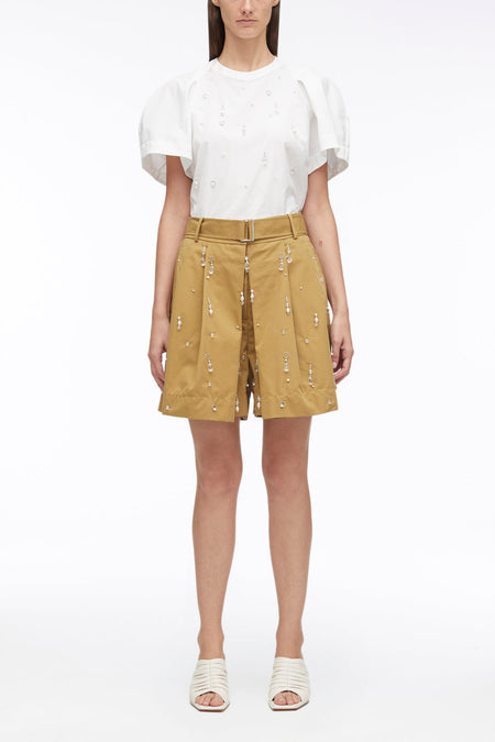 Pleated chino short in a cotton blend with dripping faux pearl embellishments. High waist and belt loops. Features an adjustable belt with a geometric buckle. Side slip and back welt pockets. Concealed front closure. Relaxed fit.