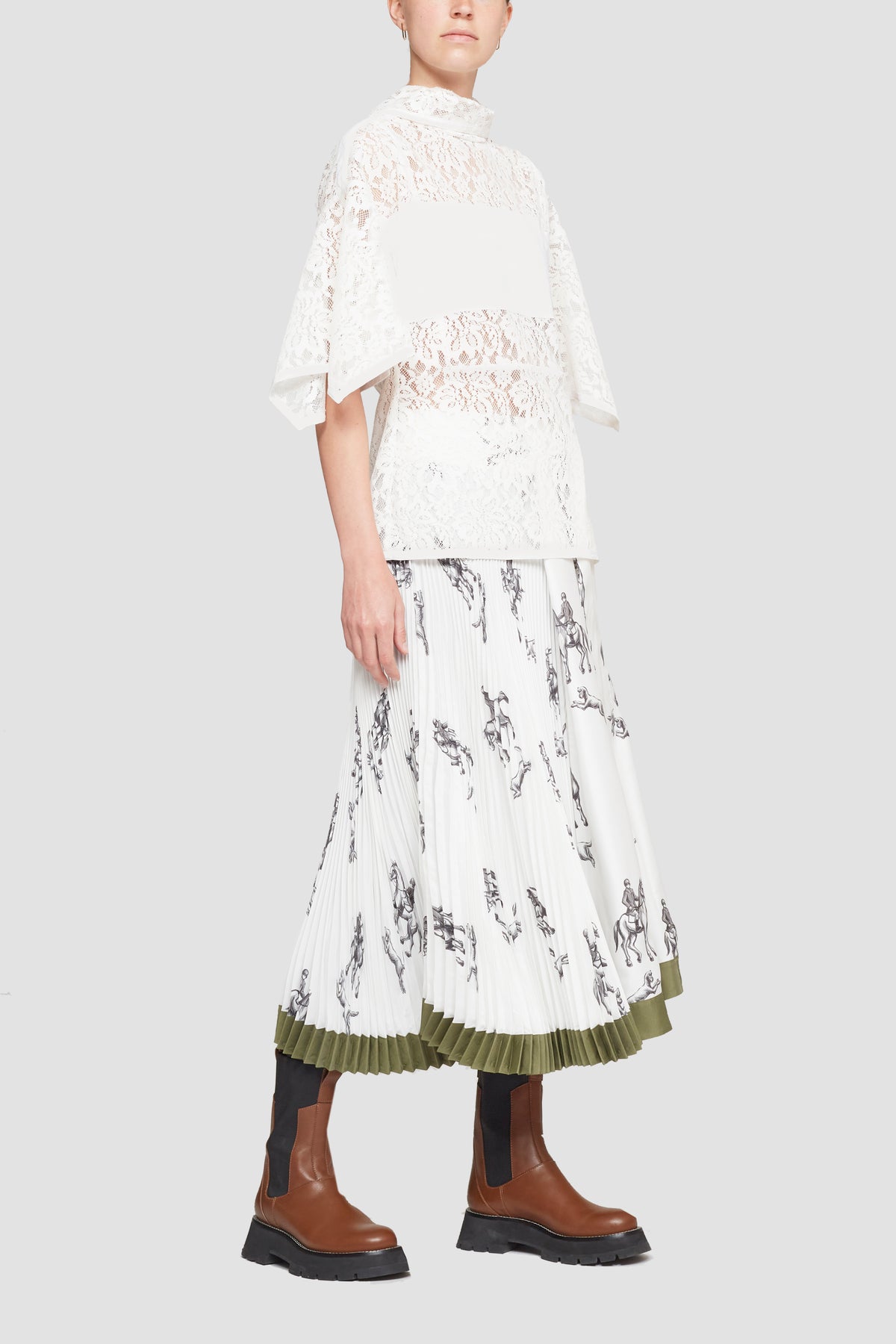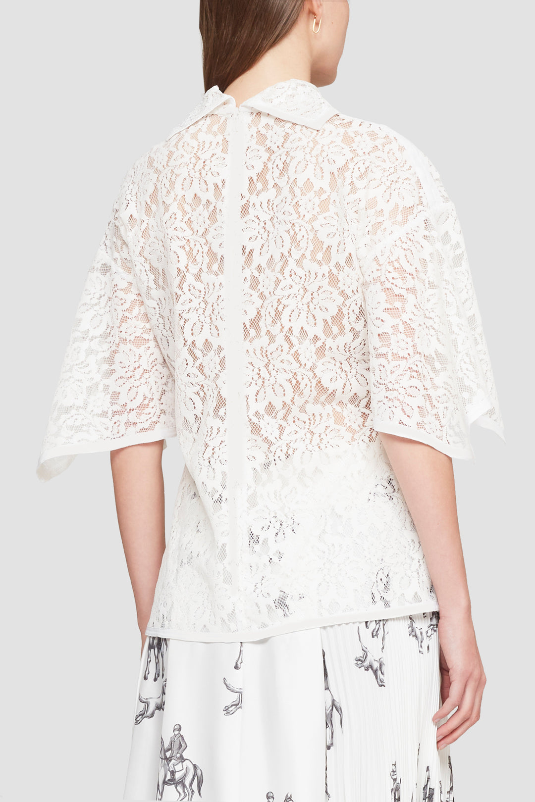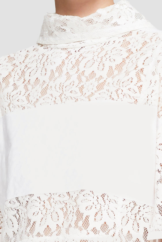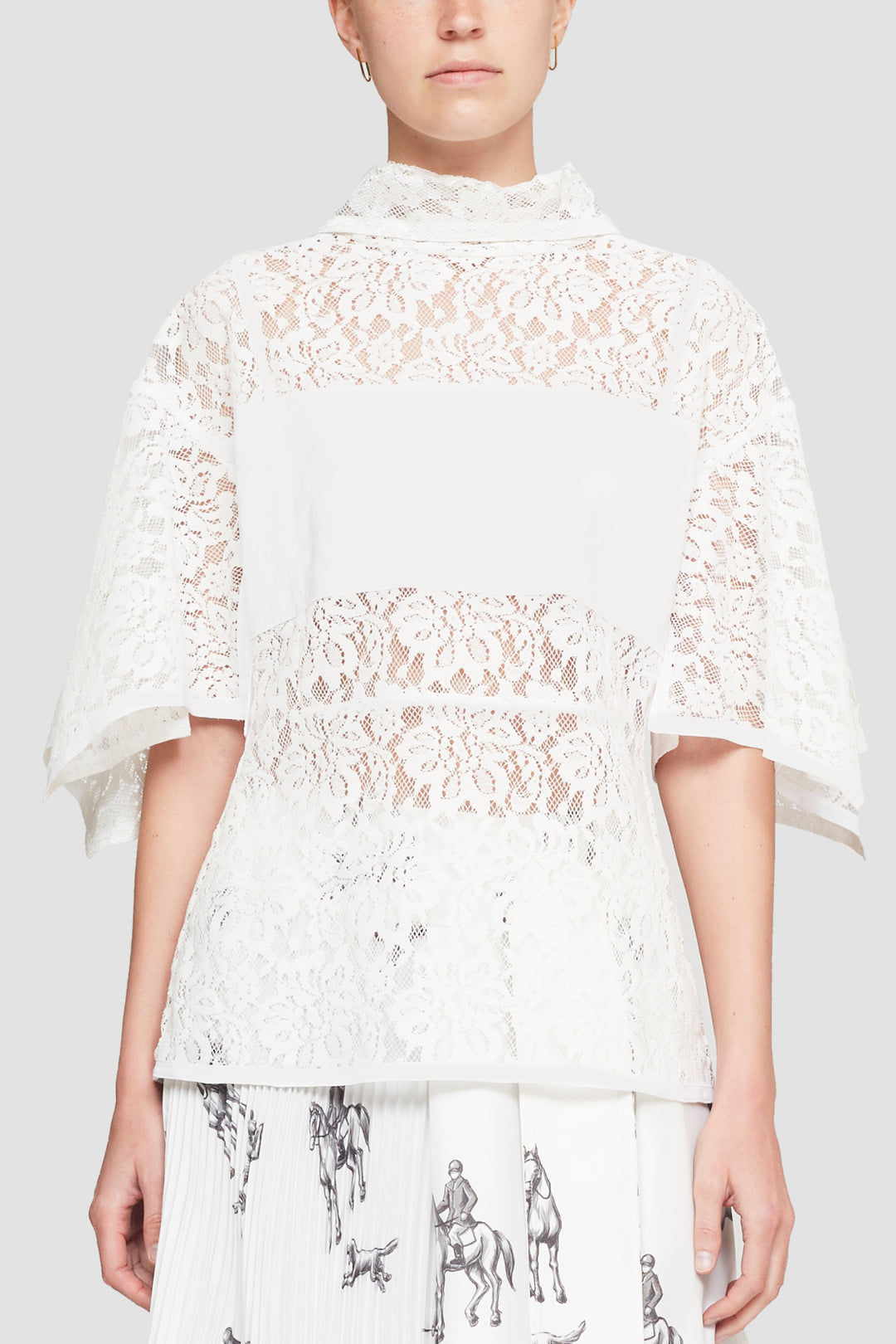 Flocked lace blouse with a solid front panel at the chest. Turtleneck with a back split. Drop shoulders and short petal sleeves. Concealed zip back closure.