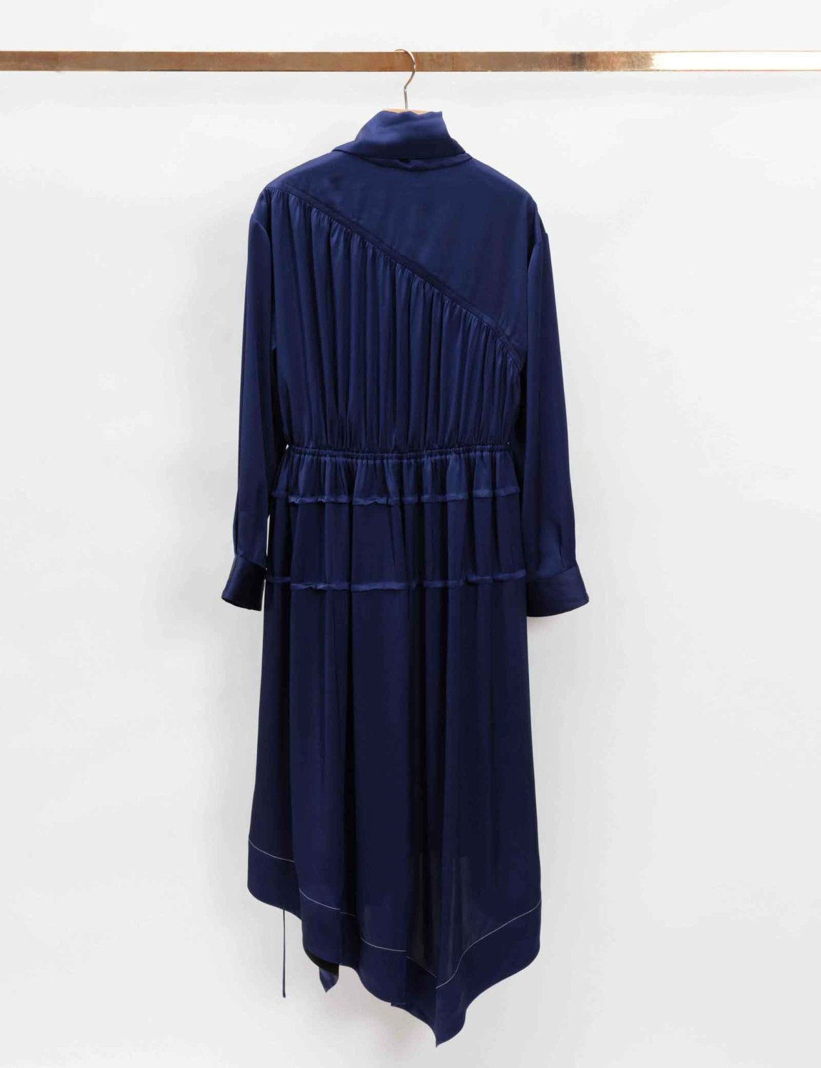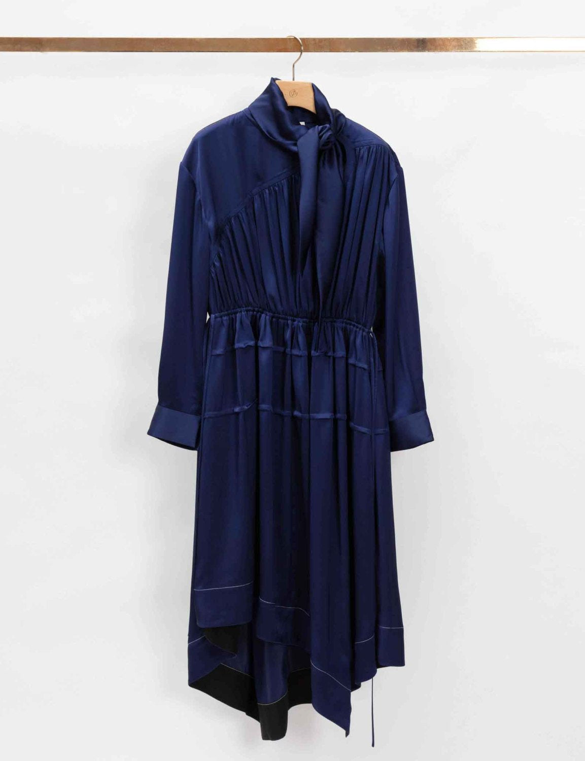 Dress in lightweight satin with an asymmetrical panel at one shoulder and a self-tie scarf at the neckline. Features a circular cut out at the front and gathered yoke. Long sleeves with button cuffs. Ruched waist with side drawstring ties. Layer effect skirt with an asymmetrical knee length hemline.