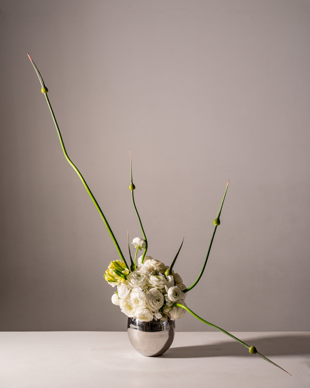 Floral Materials: White Ranunculus, Alliums, and Parrot Tulip. Offered in four different size variations.