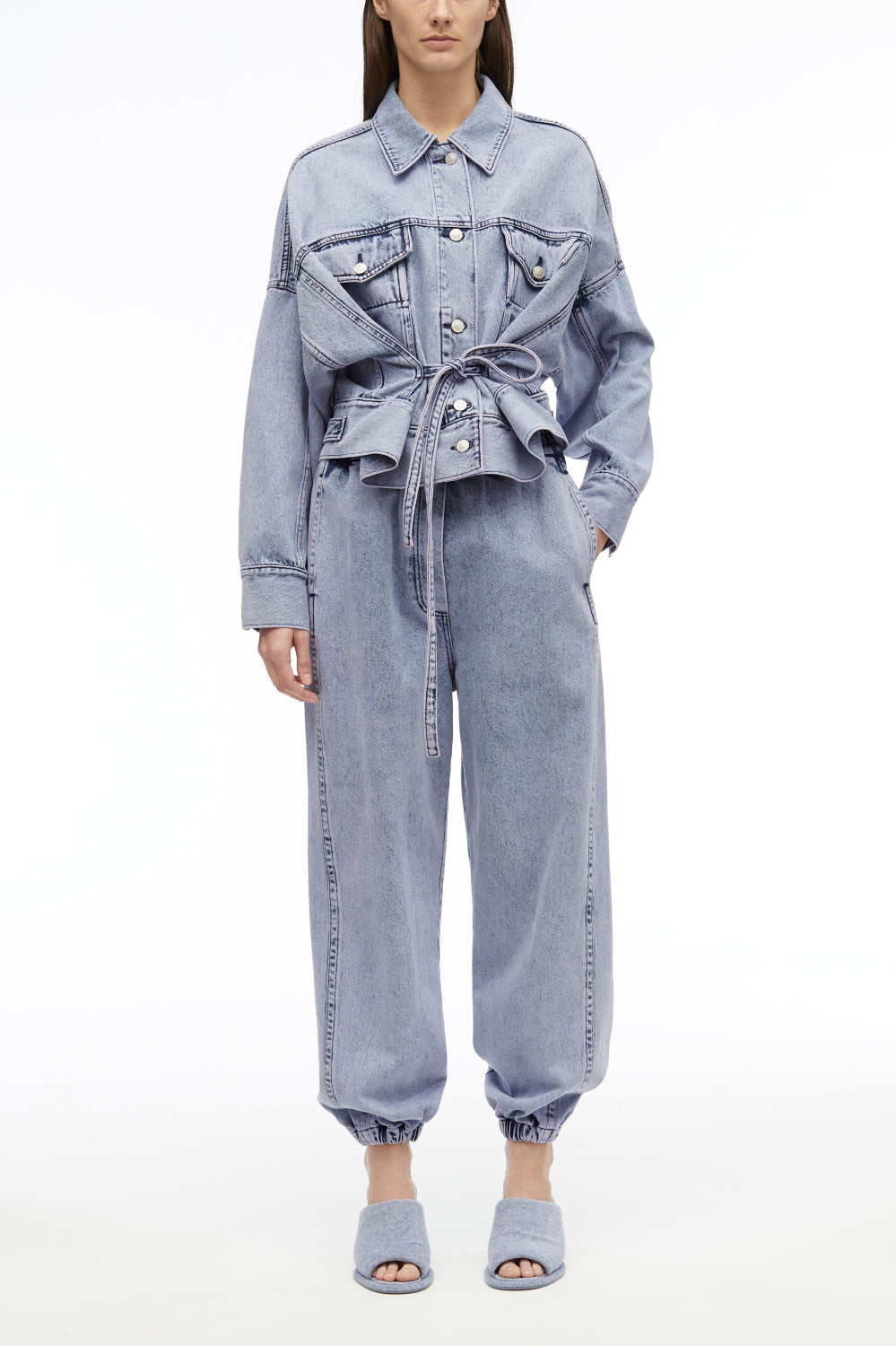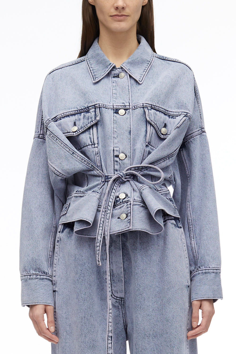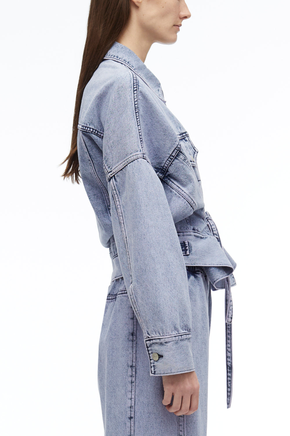 Boxy jacket in overdyed cotton denim with a paneled construction. Features extended side ties that fasten to cinch the silhouette. Point collar. Drop shoulders and long sleeves with button cuffs. Chest flap and side slip pockets. Adjustable button tabs and denim patch at the back. Button front closure.