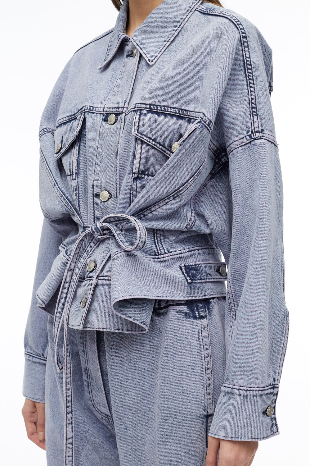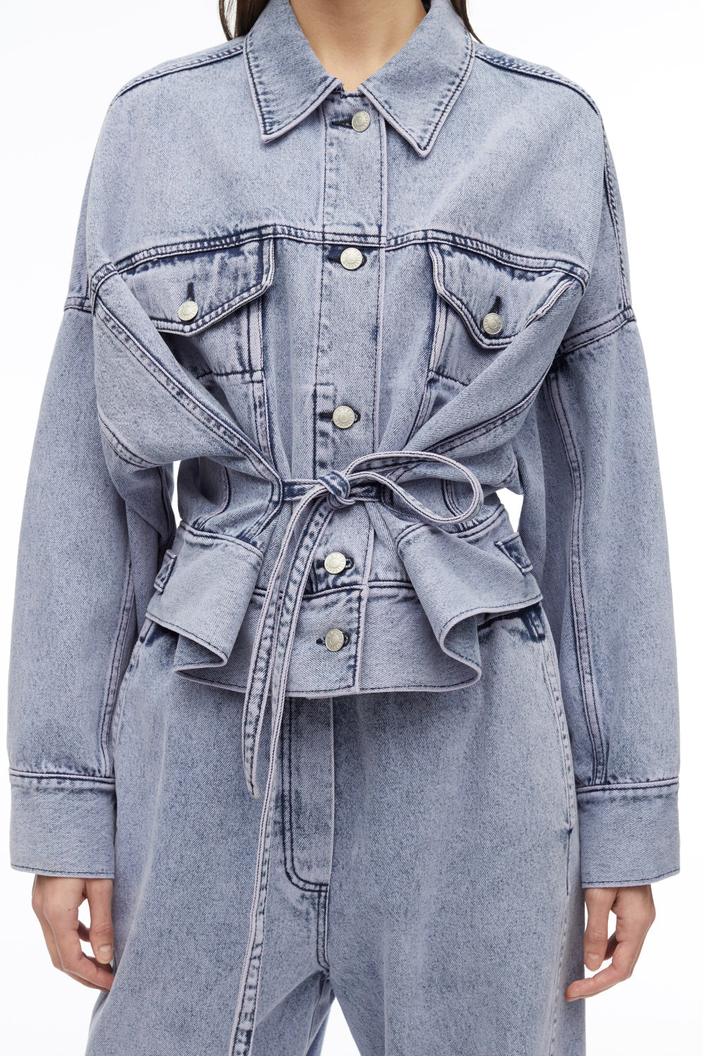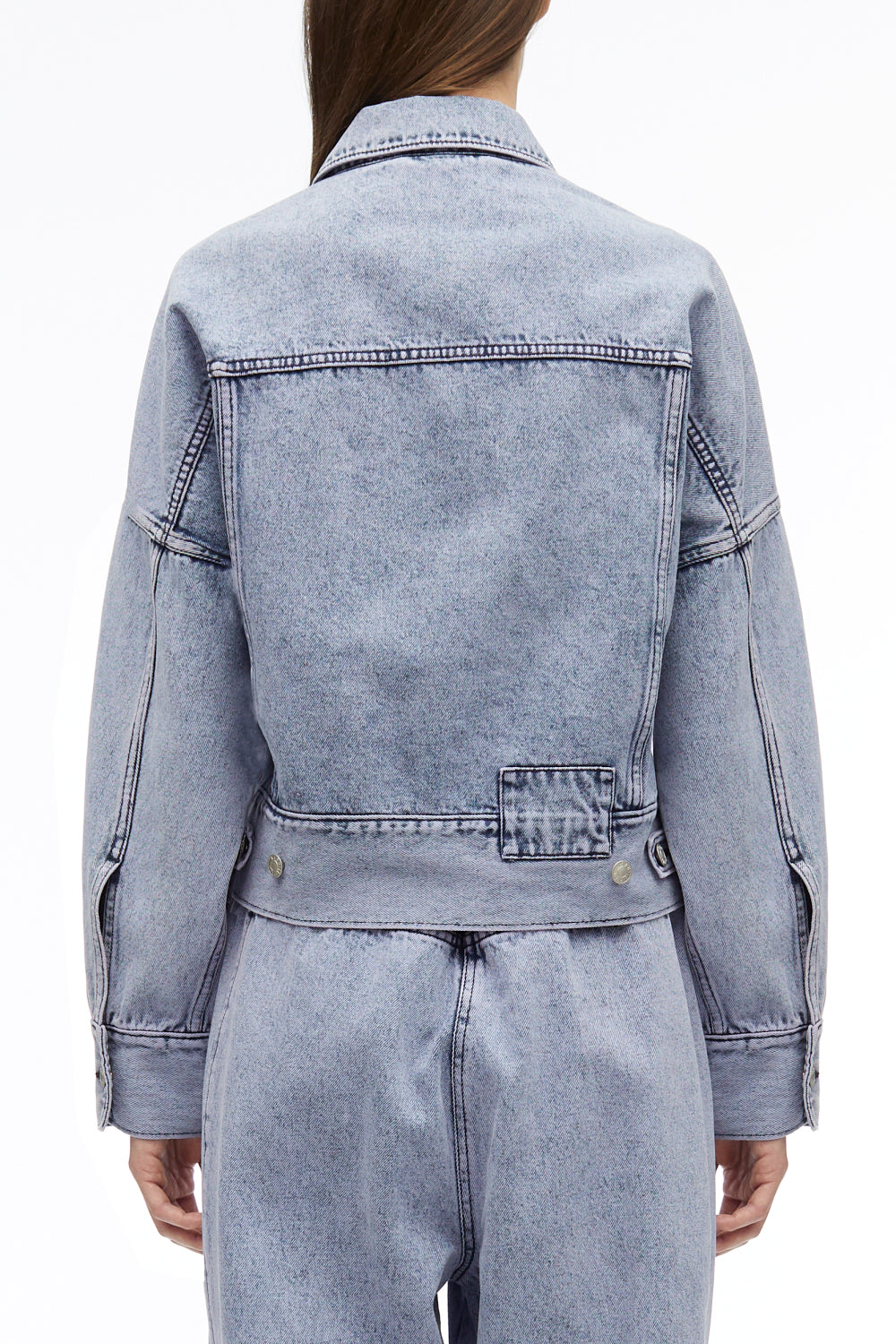 Boxy jacket in overdyed cotton denim with a paneled construction. Features extended side ties that fasten to cinch the silhouette. Point collar. Drop shoulders and long sleeves with button cuffs. Chest flap and side slip pockets. Adjustable button tabs and denim patch at the back. Button front closure.