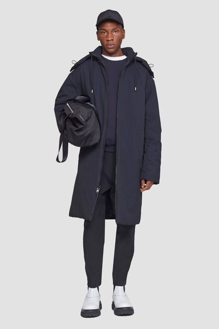 Bistretch pinstripe shell with full quilted lining. Funnel neck with drawstring. Zip off hood. Long sleeves. Double zip front closure. Zipper hand pocket outside, snap welt pocket at inside chest.