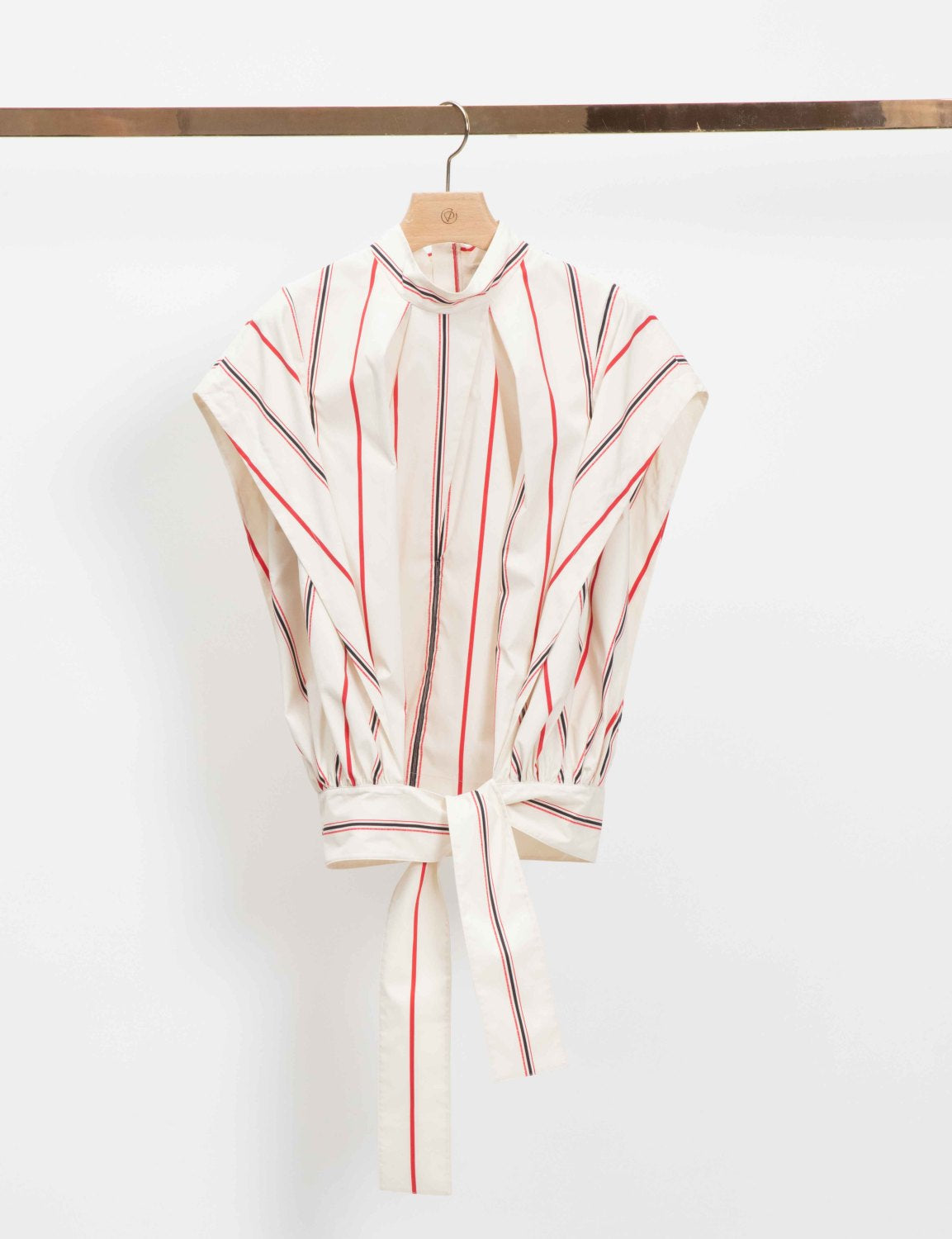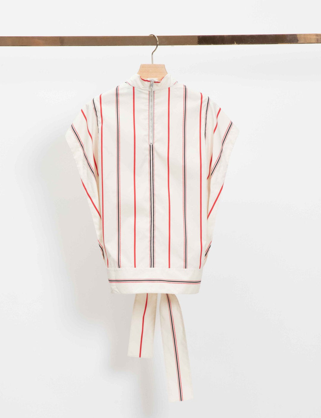 Striped sleeveless poplin top with a stand collar and inverted front pleats. Features gathered sides and extended self ties at the hemline. Exposed zip back closure.