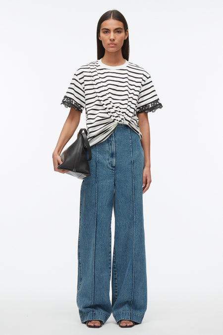 Crewneck T-shirt in striped cotton jersey with a draped front, and embroidered lace detail on the sleeves. Drop shoulders and short sleeves. Asymmetric hemline with tucked detail. Relaxed fit.