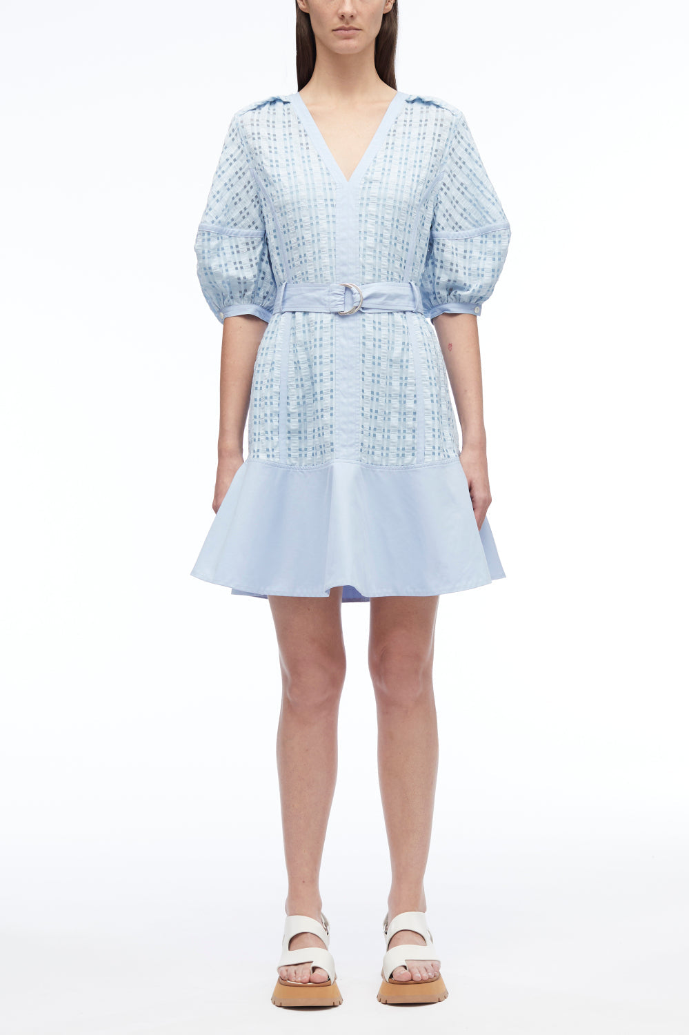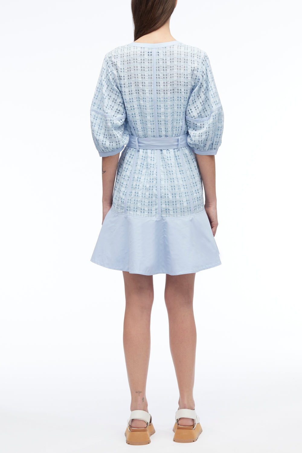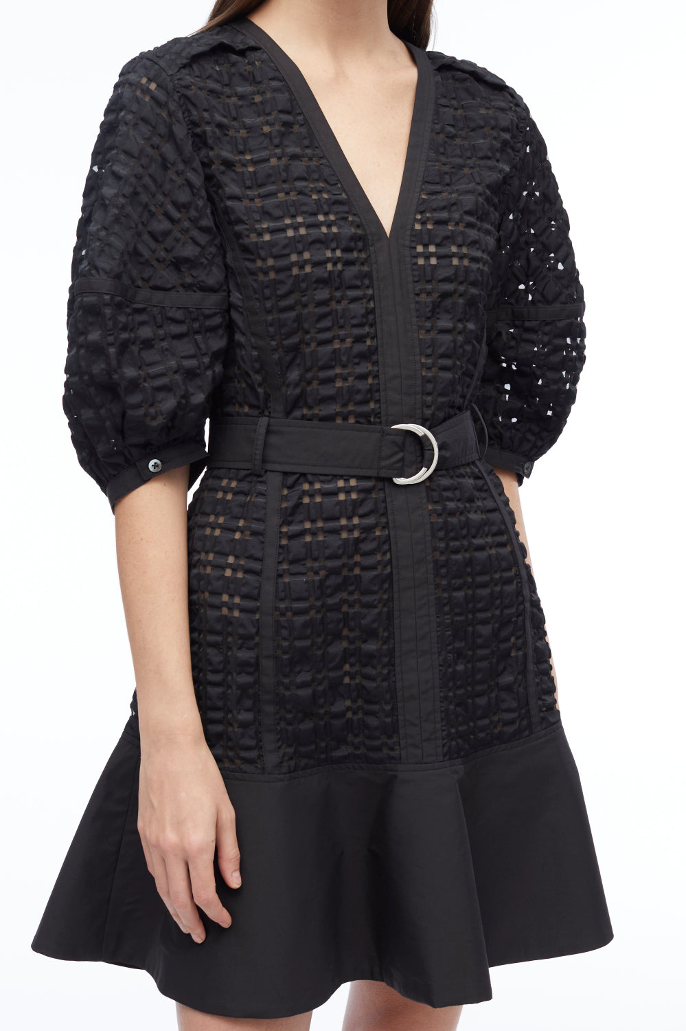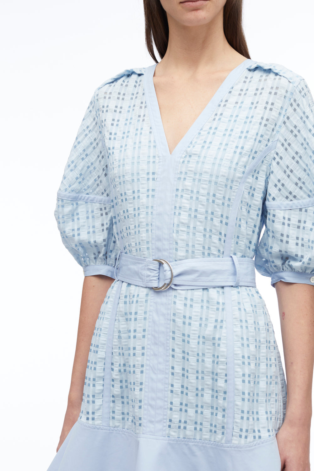 Puff sleeve dress in checked taffeta with a V-neck. Features a fitted waist and an extended belt with a silver toned metal D-ring buckle. Mini length hemline. Invisible side zipper. Slim fit.