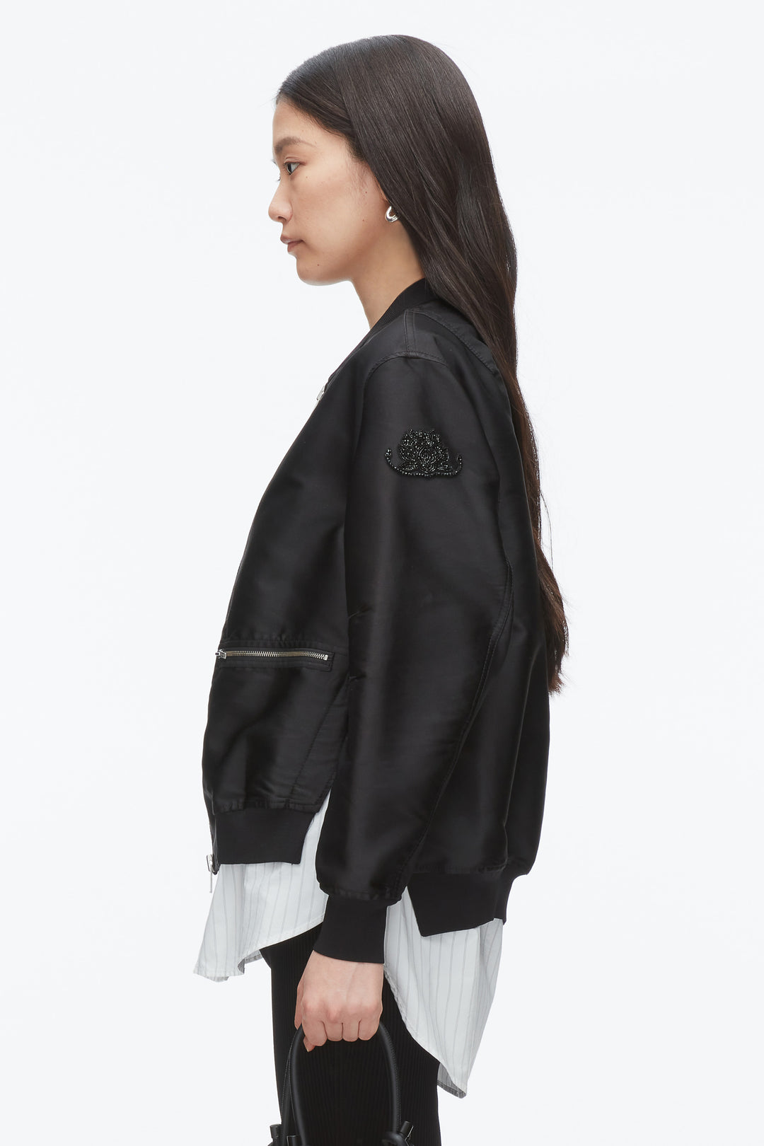 Satin bomber jacket layered over contrasting pinstripe shirt. Ribbed neck and cuffs. Front zip closure and zip pockets.